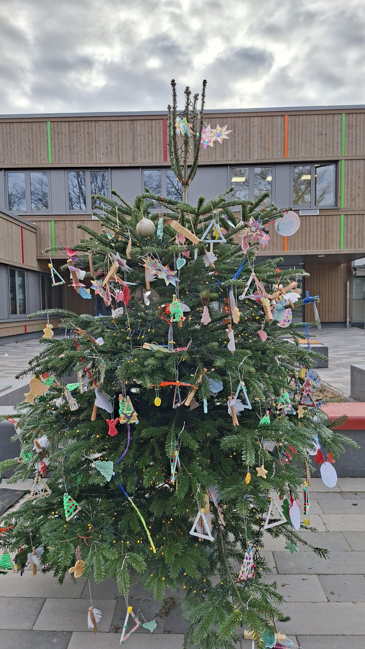 In allen Klassen wurde gebastelt und jedes Kind hängt im Laufe des Tages seinen Baumschmuck in den Baum. So haben wir einen tollen, bunt geschmückten Weihnachtsbaum vor der Schule stehen.