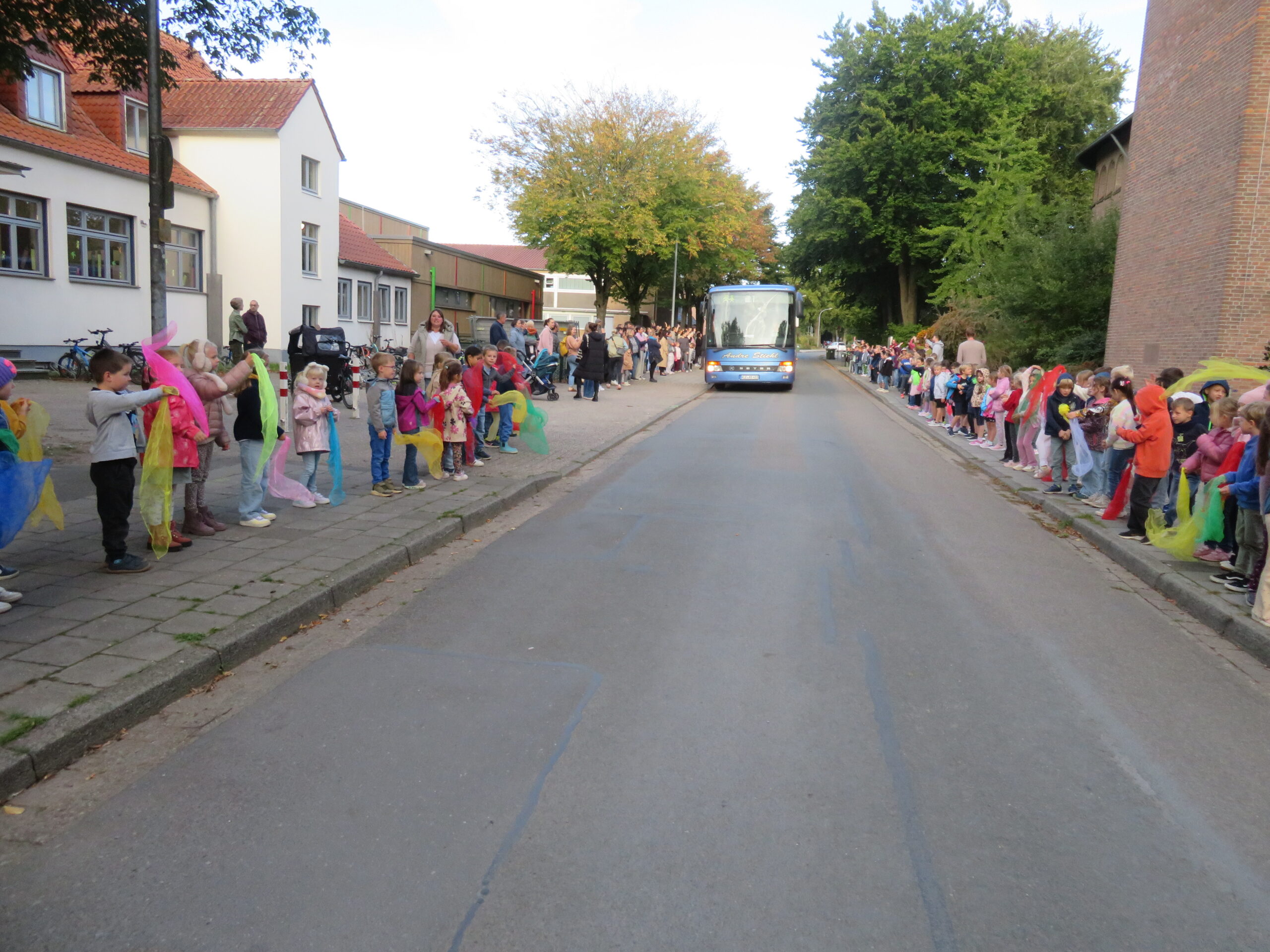 Wie in jedem Jahr steht die ganze Schulgemeinschaft Spalier, wenn sich der Bus mit unseren Viertklässlern in Bewegung setzt.