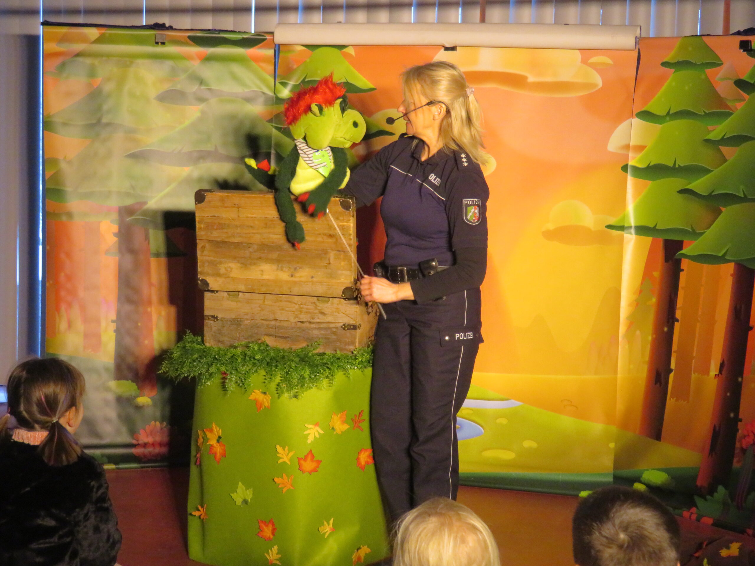 Die Polizistin Stephanie und der Drache Feo erkären den Kindern der Fledermausklasse 1a und der Drachenklasse 1b besonders abwechslungsreich, wie sie sich richtig und sicher im Straßenverkehr verhalten. Tipps gibt da außerdem Mr. Bordstein.
