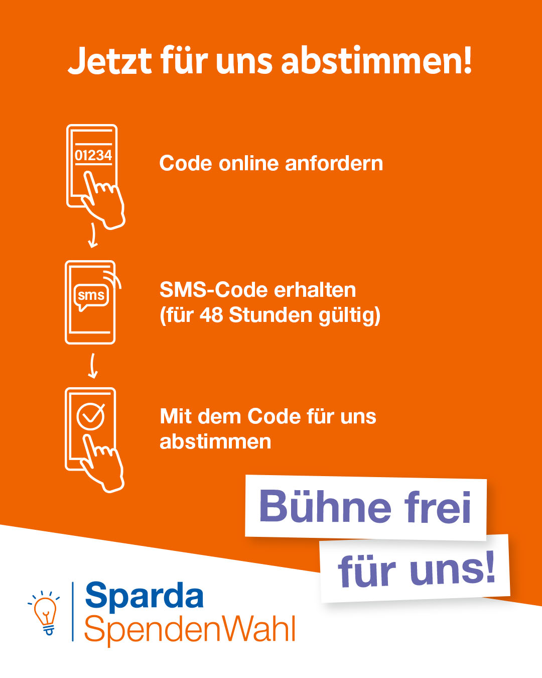 Um eine finanzielle Unterstützung zu erhalten, benötigen wir ganz viele Stimmen. Kostenfrei kann einmal pro Handynummer mit einer SMS abgestimmt werden. Bitte stimmen Sie für uns ab und bitten Sie in Ihrem Umkreis um Unterstützung.